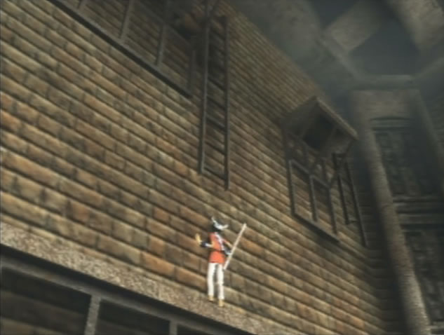 The view will shift to show you when you are under the ladder. Just jump up to grab it.
