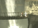 On the far side of the doorway is a wooden walkway. Follow it to the left until it ends. Now follow the rock path over to the left. A short way along you will encounter a small waterfall; follow the water's course down to the left until you get to another walkway. When you reach it, climb up the ladder on to it, and follow it. After going up a bit you will find a large gap in the walkway. Jump across, and then help Yorda to do the same. Once you're both across, carry on along the walkway.