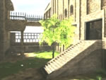 Follow the walkway on the far side of the door into a large building. Go down the stairs to the lower area. At the far end of the building, on opposite sides, are a ladder and some kind of machine. The door out is also over there, but it is closed, so you'll have to find another way. Climb up the ladder to the platform at the top. Jump up and grab the pipe over the platform, then shimmy around to the left to another platform. Along the way there is a gap in the pipe, simply keep shimmying left, and Ico will drop down onto the lower bit. When you reach the second platform, let go of this pipe and grab the other one, then shimmy left along that to another platform. When you get to the third platform, let go of the pipe, pull the lever, and climb down the ladder to the ground. The ladder doesn't reach all the way to the ground, so simply let go when you get near the bottom. Return to the lower area and go over to the machine, which is now in operation. A small platform outside the cage pops up and down at regular intervals. You will either find this very easy or very difficult. You must stand on the platform, and jump just as it starts to rise. If you do it right, Ico will be catapulted up, and will grab a ledge on the wall far above. If you get it wrong, nothing much will happen. Just before it pops up, it will slowly move down a small distance. The best time to jump is when it gets to its lowest point. When you get it right you will find yourself hanging off a ledge. Climb up a few times to get to a high platform with a doorway leading outside.